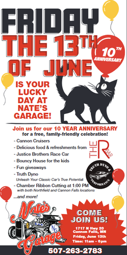 Join us in celebrating a remarkable milestone—10 years of Nate’s Garage serving the community with dedication, expertise, and a passion for automotive excellence! In honor of this exciting anniversary, we’re thrilled to host a joint Ribbon Cutting Ceremony with the Cannon Falls Chamber of Commerce.